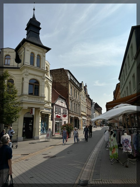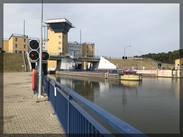 Wir folgen dem Kanal ein kurzes Stück bis zu einer beeindruckend großen Schleuse. Hier würde der Elberadweg nach links abgehen aber wir fahren erstmal geradeaus weiter auf einem guten Schotterweg bis in die Ortschaft Burg. Diese ist bekannt dafür, besonders viele Türme zu haben. Naja, wenn wir es vorher nicht gewusst hätten, wäre es uns vermutlich nicht aufgefallen. Aber die Stadt gefällt uns trotzdem gut. Wir rollen durch die hübsche Fußgängerzone, in der gerade ein Markt stattfindet und biegen dann ab, um zum Park am Weinberg zu kommen. Dieser Park wurde für die Landesgartenschau 2018 angelegt und es gibt es einen tollen Spielplatz, wo wir eine längere Pause einlegen. Dirk holt am Beginn der Pause in einem nahegelegenen Supermarkt frische Getränke und eine Brotzeit.