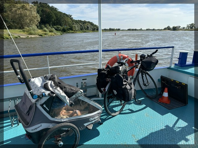 Auf einem straßenbegleitenden Radweg werden wir von viel Rückenwind nach Parchau gepustet und dahinter wunderschön über die Felder wieder zum Elberadweg. Wir hatten gelesen, dass hier umfangreiche Deichbauarbeiten stattfinden sollen – diese möglichst weit zu umfahren war auch mit ein Grund für den Abstecher nach Burg – aber zumindest hier scheint alles schon vorbei zu sein. Wir fahren nun zum Großteil hinter dem Deich parallel zu diesem nach Norden und kommend dabei immer mal wieder an Ansammlungen von Schafen vorbei. Vorangetrieben vom Wind fliegen wir geradezu nach Parey-Schleuse. Hier führt zumindest eine Alternative des Elberadwegs über die namensgebende Schleuse. Dieser kürzeste Weg in Richtung unseres Ziels ist für uns aber unfahrbar, da wir die Räder mitsamt Anhänger über eine steile und hohe Treppe tragen müssten. Dann nehmen wir halt die andere Alternative, ein gutes Stück nach Süden in Richtung Neuderben. Der schöne Rückenwind kommt nun leider nach vorne, so dass wir froh sind, als wir wieder die Richtung wechseln können, um ins sehr langgezogene Derben weiter zu radeln. Dieses geht direkt in die Ortschaft Ferchland über, von wo aus sich die Elber per Fähre überqueren lässt. Wir müssen diese Fähre heute noch nehmen, haben aber im Voraus keine Infos darüber gefunden, ob sie fährt oder nicht. Wir sind sehr froh, als wir auf der Brücke einen eine späte Mittagspause machenden Fährmann entdecken.