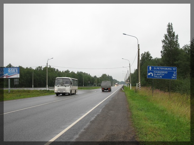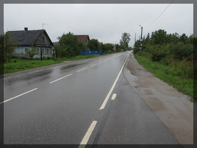 Beim Verlassen wird Kingissepp nicht gerade schöner. Hinter der Stadt fahren wir zunächst wieder auf die E20. Dieser folgen wir bis Opolya, wo wir auf eine kleinere Straße abbiegen. Inzwischen hat es zu regnen begonnen und die folgenden Stunden haben wir vor allem als nass in Erinnerung. Es regnet durchgehend, mal stärker mal schwächer. In den schwächeren Regenphasen gibt es allerdings garantiert mindestens einen entgegenkommenden Lkw, der auf unserer Höhe garantiert eine Pfütze erwischt und uns von Kopf bis Fuß duscht (bei ausgewählten Pfützen bekommen das auch Pkws sehr gut hin).