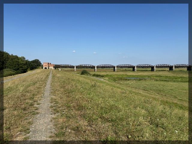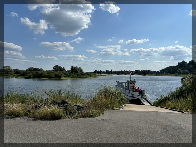 Nach einigen weiteren Biegungen der Elbe erreichen wir die Ortschaft Hitzacker. Da wir wieder einmal recht gut vorangekommen sind, machen wir auf einem schönen Spielplatz in einer Parkanlage eine lange Pause. Der Park liegt direkt neben einer Ausgrabungsstätte, an der unter anderem über 3000 Jahre alte bronzezeitliche Häuser ausgegraben wurden. Von hier aus müsste man über eine kleine Holzbrücke recht schnell zu einem Supermarkt kommen und Dirk schwingt sich aufs Rad, um Getränke und Eis zu holen. Leider scheint die Brücke baufällig zu sein oder gerade sonstwie umgebaut zu werden, sie ist jedenfalls gesperrt. Also den langen Weg außen rum. Wir kommen so oder so zu unserm Eis. Witzigerweise hat etwas später eine Schulklasse, von der anderen Seite der Brücke kommend, genau dasselbe Problem. Bis die Horde Schüler samt Betreuer einen Weg um die marode Brücke gefunden hat, sind wir fast schon wieder beim Aufbruch. Die Innenstadt von Hitzacker selber mit ihren vielen Backsteinhäusern ist sehr hübsch hergerichtet, aber auch extrem touristisch und überlaufen. Wir sind froh, nicht hier zu übernachten. Dirk hat recht kurzfristig eine alternative Übernachtungsmöglichkeit gebucht, für die wir noch etwas weiterfahren müssen. Also Richtung Elbfähre. Die Drehbrücke am Hafen sollte laut Auskunft auf der städtischen Webseite eigentlich aufgedreht sein und in ein paar Minuten geschlossen werden. Wir können aber einfach drüberfahren und sind ein ganz klein bisschen enttäuscht. Wann bekommt man als Bayer schon einmal eine sich drehende Brücke zu Gesicht? Die Räder mitsamt Anhänger auf die Fähre zu bekommen ist etwas hakelig, zum Glück hilft der nette Fährmann.