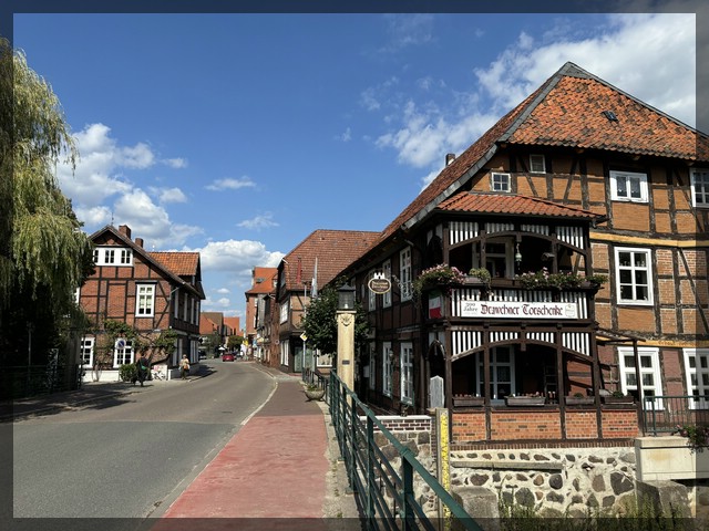 Gorleben ist ein hübsches Städtchen mit schönen Backsteinhäusern und dürfte den etwas älteren Lesern noch gut bekannt sein: Ende der siebziger Jahre wurde entscheiden, dass hier eine Wiederaufbereitungsanlage für atomaren Müll sowie ein Endlager errichtet werden sollen. Die Proteste dagegen dauerten bis weit in die achtziger Jahre hinein und waren sehr kreativ: unter anderem wurde in einem Hüttendorf die Republik Freies Wendland gegründet – das Symbol dieser Republik, eine orange Sonne auf grünem Grund kann man in der Gegend manchmal noch sehen, beispielsweise auf Autoaufklebern. Ein weiteres Symbol des Widerstands, farbige Holzkreuze, heute in einem anderen Kontext verwendet: wir sehen einige davon mit der Aufschrift: „Für Vielfalt – Kreuze ohne Haken“. Im Rahmen der Proteste gegen das Atommülllager wurde zudem kurzzeitig ein Stück der damaligen DDR besetzt. Heute gibt es noch das damalige Erkundungsbergwerk und daneben ein Zwischenlager, aber daran führt unserer Route nicht vorbei. Woran wir vorbei kommen ist ein kleines Museum, welches aber aktuell geschlossen ist. Also fahren wir weiter, verlassen Gorleben wieder und folgen ein gutes Stück wieder der L256 und später der K27. Ein Radweg führt weite Strecken entlang der Straßen, der Elberadweg löst sich aber wo immer möglich von diesem Radweg.