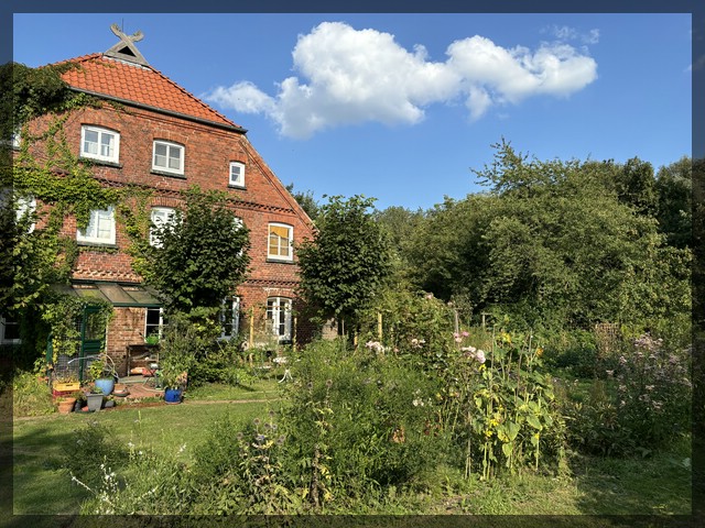 Der Landstrich auf der nördlichen Seite der Elbe hat früher zur DDR gehört und dann zum Bundesland Mecklenburg-Vorpommern. Erst 1993 kam die Gegend zu Niedersachen. Eine Erinnerungstafel erzählt die Geschichte einer der ersten Fährfahrten nach der Öffnung der Grenze, genauer im Dezember 1989: ein Passagier starb nach einem Herzinfarkt, da er nicht mit dem Hubschrauber gerettet werden konnte. Es gab kein Abkommen zwischen den beiden deutschen Staaten über den Einsatz von Rettungshubschraubern. Geschichten, die man heute nicht mehr glauben mag. Wir müssen nur noch ein paar Kilometer am Deich entlangfahren und erreichen dann unsere Unterkunft für heute. Ein altes und liebevoll hergerichtetes Bauernhaus, direkt hinter dem Deich gelegen, inmitten einer wunderschönen Gartenanlage. Das Ganze nennt sich Paradiesgarten und hat diesen Namen auch verdient. Das hier ist wirklich eine der besten und schönsten Übernachtungsmöglichkeiten auf der ganzen Tour. Nach der sehr netten Begrüßung machen wir einen Spaziergang zum Deich wo sich Alex und Franzi austoben können. Nach dem von den Gastgebern selber gekochten leckeren Abendessen – netten Gesprächen mit anderen Radfahrern inklusive - gehen wir glücklich ins Bett.