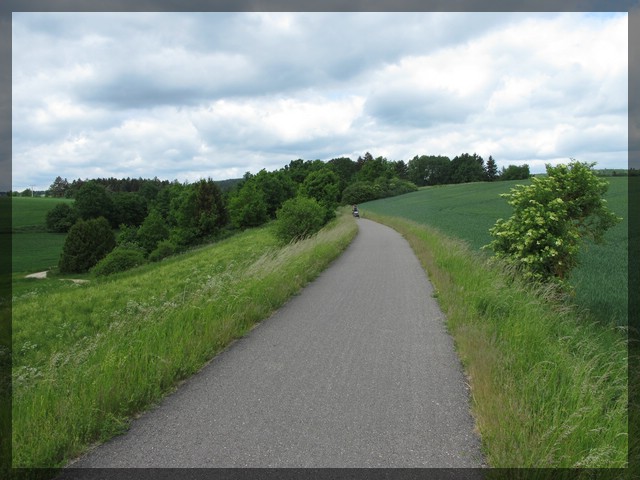 Ab Oberdolling sind wir ein kurzes Stück auf dem zwischen Ingolstadt und Riedenburg verlaufenden Schambachtalbahn-Radweg unterwegs. Um ehrlich zu sein, haben wir vorher noch nie etwas von der Schambachtalbahn gehört. Diese Nebenstrecke war bis in die Siebzigerjahre des 20ten Jahrhunderts in Betrieb, in Teilstrecken bis in die Neunzigerjahre und wurde Stück für Stück in einen nun insgesamt 45 Kilometer langen Radweg umgewandelt. Das Ganze ist sehr schön geworden und wir finden es fast ein wenig schade, als wir nach etwa zehn Kilometer bei Sandersdorf den Bahnradweg wieder verlassen müssen.