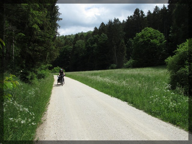 Etwa einen Kilometer nördlich kommen wir nach Schamhaupten mit dem gleichnamigen Schloss und der Quelle der Schambach, nach dem das Tal, die ehemalige Eisenbahnstrecke und der Radweg benannt sind. Hier folgen wir nicht der großen Bundesstraße B299, sondern knicken in Richtung Westen ab, um unserer Sammlung an prominenten Radwegen ein weiteres Exemplar hinzuzufügen, und zwar den Limes-Radweg, der dem ungefähren Verlauf der alten römischen Grenzbefestigung folgt. Ein kurzes Stück über offene Felder, dann in einen schönen Wald. Immer auf absolut einsamen und geschotterten Waldwegen. Im Schotter fährt es sich mit dem Anhänger gar nicht so geschmeidig. Da es zudem die ganze Zeit leicht bergauf geht und zudem ein guter Gegenwind herrscht, nimmt Dirks Geschwindigkeit arg ab und Katharina muss mehrfach lange warten. Hinter dem schönen Wald kommen wir durch kleine und bäuerlich geprägte Ortschaften. Hier wird die Strecke sehr hügelig und an zwei der Anstiege kommt Dirk mit dem Gewicht des Anhängers wieder ziemlich ins Pumpen.