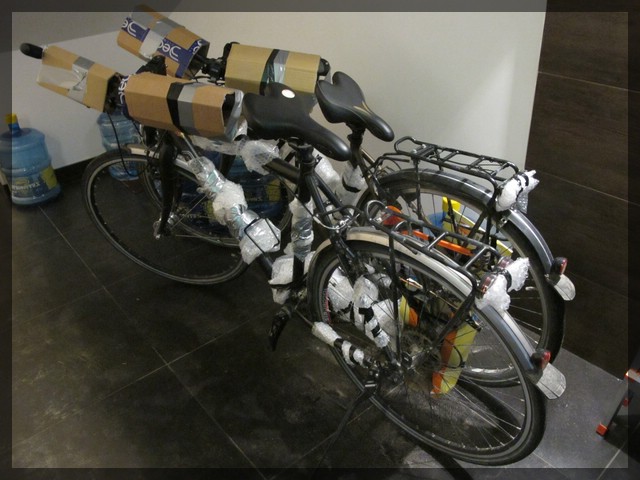 Am Flughafen schon ziemlich viel los. Dennoch läuft alles zwar etwas umständlich aber Schritt für Schritt in die richtige Richtung: zuallererst müssen mir mit Fahrrädern und Gepäck durch eine erste Sicherheitskontrolle. Dann geht es zum Baggage Drop Off, wo wir je eine vollgestopfte Satteltasche abgeben (die andere nehmen wir als Handgepäck) und unsere Fahrräder bekommen Gepäckaufkleber. Die zuständige Dame ist leicht verplant und falls wir nicht explizit nachgefragt hätten, hätte sie vergessen, Dirks Boarding Pass zurückzugeben. Dann müssen wir die Räder abgeben - hier muss noch das Vorderrad abmontiert werden, da sonst die Räder nicht durch die Durchleuchtungsmaschine passen. Wir fixieren die Räder an den Rahmen und müssen dann noch einige Minuten warten, da inzwischen die Durchleuchtungsmaschine kaputt gegangen ist. Dann geht es durch die Immigration. Die junge Zöllnerin hat anscheinend wenig Ahnung, haut den Ausreisestempel bei Dirks Pass an die falsche Stelle - diskutiert dann einige Minuten mit der Kollegin vom Nachbarschalter und Katharina bekommt den Stempel an die richtige Stelle. Als Höhepunkt kommt dann noch ein zweiter Sicherheitscheck.