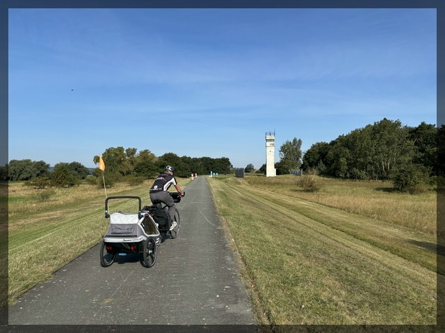 Passend zum guten Abendessen gestern gibt es ein sehr gutes Frühstück. Nach der herzlichen Verabschiedung von der netten Wirtin rollen wir bei perfektem Wetter weiter, zuerst zurück zum Deich und dann diesem nach Westen folgend. Ein paar Kilometer hinter dem Paradiesgarten kommen wir zu einem Denkmal, welches daran erinnert, dass hier zu DDR-Zeiten systematisch Häuser und sogar ganze Ortschaften entvölkert und zerstört wurden, um Möglichkeiten für eine Flucht in den Westen zu beseitigen. Die Bilder und Karten von der Gegend vor dieser Aktion sind doch recht bedrückend.