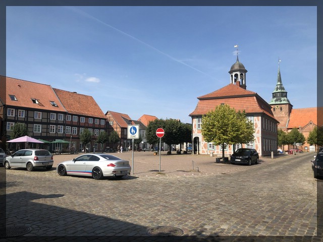 Dann wieder – wie gehabt – immer entlang dem Deich in Richtung Westen. Kurz darauf rollen wir in das siebte Bundesland unserer Tour. Und zwar schneiden wir durch ein ganz kleines Stück von Mecklenburg-Vorpommern. Wir kommen in eine hübsche kleine Stadt, deren Innenstadtbereich unserer Meinung nach zu Unrecht vom Elberadweg umfahren wird, und zwar Boizenburg. Wir verlassen den großen Radweg, und rollen über hübsche Außenbezirke in die Innenstadt. Ganz besonders gut gefällt uns der große Marktplatz mit dem zentral und alleine auf dem Platz stehenden Rathaus von 1711. So etwas haben wir bisher nur in Polen gesehen, zum Beispiel in Chelmno an der Weichsel. Direkt nördlich vom Marktplatz steht die große evangelische St. Marienkirche. An einer Eisdiele auf dem Marktplatz legen wir eine ausgedehnte Pause ein – wir freuen uns dabei sehr über den Schatten, den die Schirme der Eisdiele spenden. Das war ein sehr hübscher und lohnenswerter Abstecher. Am Ortsausgang von Boizenburg überrascht uns ein nicht wirklich langer und nicht wirklich steiler Anstieg. Dirk aber wird durch die bis zu sieben Prozent Steigung gut abgebremst. Dafür genießt er die darauffolgende Abfahrt umso mehr.