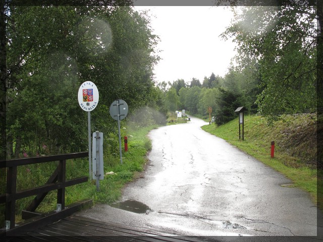 Hinter Haidmühle geht es ein Stück bergab und dann über einen reinen Fußgänger- und Radfahrergrenzübergang nach Tschechien. Der Radweg hier ist ein perfektes schmales Asphaltband und führt durch einen schönen Wald nach Norden. Zeitweise parallel zu einer Bahnlinie, manchmal ergeben sich auch Blicke auf die Kälte Moldau. Wie letztere sich über blumenbestandene Lichtungen schlängelt, erinnert das eine oder andere Mal irgendwie an Landschaften im Nordwesten der USA.
