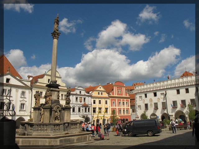 Kurz vor Cesky Krumlov geht es wieder gut bergab und das letzte Stück in die Ortschaft führt entlang der vielbefahrenen Haupstraße. Cesky Krumlov, Weltkulurerbe, aber in Deutschland so gut wie unbekannt, entpuppt sich im Altstadtbereich als tolle mittelalterliche Stadt mit einer beeindruckenden Burganlage. Und extrem von Touristen überlaufen, vor allem aus Asien. Wir heben tschechisches Geld ab und legen am schönen Marktplatz eine Kuchenpause ein.