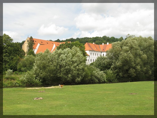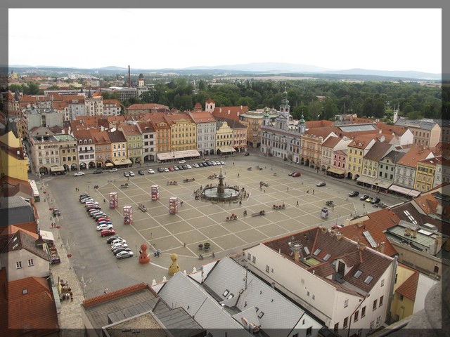 Weiter geht es, zunächst gut bergauf, dann bei Zlata Koruna mit seinem Kloster wieder bergab. Hier ist der Startpunkt von scheinbar sehr beliebten Kanutouren – diese hatten wir auch schon in Cesky Krumlov gesehen. Das alles erinnert sehr an die Altmühl… Noch ein letzter knackiger Anstieg, dann sind wir im Hügelland südlich von Budweis angelangt. Am Horizont das Atomkraftwerk Temelin, nähern wir uns der Stadt, müssen kurz vorher ein kurzes Stück auf eine größere Straße, ehe wir auf einen perfekten Stadtradweg an der Moldau ausweichen. Unser Hotel liegt direkt am Marktplatz, bei dessem Anblick sich Brettspielfreunde sofort an das Spiel „Thurn und Taxis“ erinnert fühlen dürften.