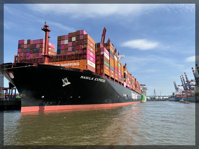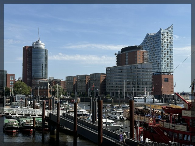 Danach laufen wir durch die Mittagshitze zu den Landungsbrücken und kaufen uns dort Tickets für eine Hafenrundfahrt. Wir Erwachsenen finden die Rundfahrt hochspannend, sehen neben riesigen Containerschiffen, großen Kreuzfahrtschiffen, Kriegsschiffen (darunter auch zwei japanische Schulschiffe) und Superjachten sogar ein Beluga-Transportflugzeug im Anflug auf das Fabrikgelände von Airbus. Die Kommentare vom Tourguide kann man gut finden oder nicht, insgesamt ist aber alles sehr vielseitig und interessant. Alex findet es aber leider streckenweise langweilig. Auch die nach der Rundfahrt gegen den Hunger gekaufte Fischsemmel mag er nicht so recht, da der Bismarckhering interessanter aussieht, als er dann letztendlich schmeckt. Zum Glück helfen Franzi und Katharina kräftig beim Aufessen mit.