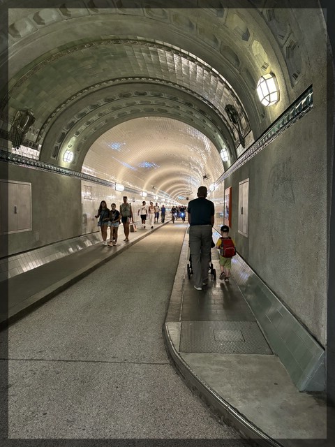 Der letzte Programmpunkt des Tages wird dann wieder ein Highlight: der alte Elbtunnel. Wir rechnen fest damit, dass auch dieser als langweilig erachtet wird und sind überrascht, als Alex die mehr als 400 Meter durch Tunnel mit den schönen Fliesenwänden bis zum anderen Ende durchstapft. Dorf fahren wir mit dem Fahrstuhl wieder nach oben und Alex marschiert dort auch freudig bis zum Aussichtspunkt. Nach dem Rückmarsch durch den Tunnel steigen Alex und Dirk sogar die mehr als zwanzig Meter bis zur Oberfläche über die Treppe wieder nach oben. Katharina und Franzi mit dem Kinderwagen nehmen den Lift. Wir fahren mit der U-Bahn in Richtung Hotel und suchen uns wieder in dessen direkter Nähe ein Abendessen.