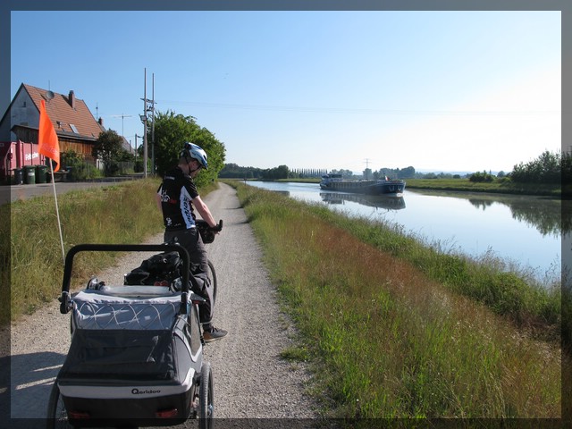 Bei Neuses überqueren wir den Kanal und fahren für ein kurzes Stück auf einer zwischen Kanal und Regnitz gelegenen Halbinsel, auf der sich früher offensichtlich irgendeine Art Industriegelände befand. Es gibt jedenfalls ein kurzes Stück nicht mehr in Betrieb befindlicher Kanal namens „Alter Werkkanal“. Heute gibt es nur noch eine Außenstelle des Wasserstraßen- und Schifffahrtsamts sowie ein paar recht interessante Kunstwerke direkt am Radweg. Weiter entlang dem Kanal kommen wir nach Hirschaid, wo wir einen direkt neben einer Kita gelegenen sehr schönen Spielplatz finden, auf dem wir einige Zeit verbringen.