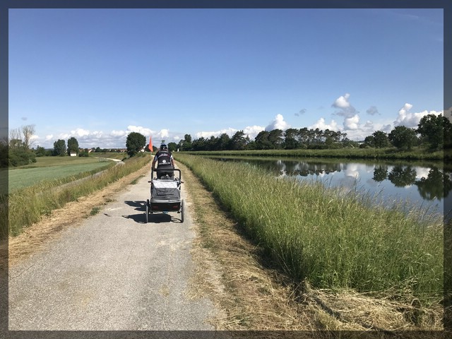 Vorbei an Strullendorf nähern wir uns dann Bamberg. Sehr viel vom Näherkommen bemerkt man auf dieser Route allerdings über weite Strecken nicht. Gut, wir fahren auf einmal nicht mehr entlang von Feldern und baumbestandenen Flächen, sondern vorbei an Kleingärten. Und am Horizont lässt sich schon der Bamberger Dom blicken. Ein kleines bisschen durch ein Industriegebiet und schon sind wir mitten im Stadtgebiet auf der schön grün angelegten Promenade unterwegs. Ähnlich wie gestern gönnen wir uns auch hier wieder an einem kleinen Imbiss mitsamt Biergarten ein kleines Mittagessen. Da wir recht früh hier sind, können wir zwar bestellen, müssen dann aber etwas warten. Die Zeit lässt sich prima auf dem direkt nebenan befindlichen Spielplatz überbrücken. Der Imbiss ist super-gemütlich, hier ist es sicher auch an lauen Sommerabenden richtig schön.