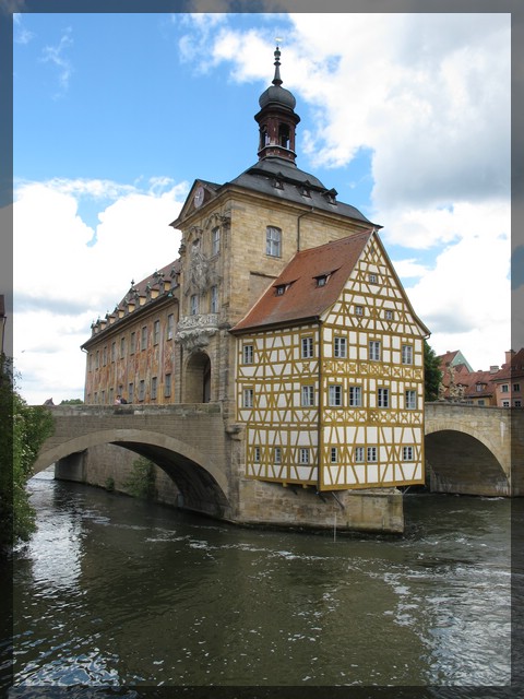 Auch wenn wir keine Zeit für ein wirklich ausgedehntes Besichtigungsprogramm haben, wollen wir einen kurzen Blick in die Bamberger Innenstadt werfen. Also überqueren wir am Wilhelmsplatz wieder den Kanal und radeln in Richtung des zentralen Bereichs. Es ist zwar viel los und für Räder gibt es teilweise nur enge Radspuren auf den Straßen, aber wir kommen dennoch problemlos voran. Die Regnitz überqueren wir auf der Oberen Brücke, zurück etwas später wieder auf dem Geyerswörthsteg, von wo aus wir einen schönen Blick auf das mitten im Fluss stehende alte Rathaus haben, welches in der jetzigen Form seit 1467 dort steht. Zwischen den beiden Flussüberquerungen machen wir einen kleinen Bogen, um ums den Bamberger Dom aus der Nähe anzuschauen. Dieser steht nun auch schon seit mehr seit 1000 Jahren auf seinen Hügel. Bei dem Dom handelt sich um ein UNESCO-Weltkulturerbe und er ist unter anderem deshalb bekannt, da sich hier das einzige Papstgrab in Deutschland und nördlich der Alpen befindet, und zwar dasjenige von Papst Clemens II. Zurück über den Grünen Markt und den Maximiliansplatz verlassen wir dann die Altstadt von Bamberg wieder. Das war zwar ein sehr kurzer Besuch, aber diese Stadt hat uns sehr gut gefallen.