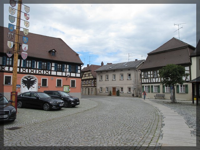 Nach Ebern, unserem heutigen Etappenziel sind es nun noch etwa 13 Kilometer: immer entlang der B279 durch die schöne und hügelige Landschaft von Unterfranken und ab und an kleinere Ortschaften. Das Wetter wird schlechter, zwischenzeitig fallen ein paar Regentropfen. Aber alles nicht dramatisch. Ebern wird von der B279 umfahren, wir erreichen die Ortschaft über eine Stichstraße. Wir haben in einer kleinen Pension vorgebucht und werde freundlich vorgebucht. Ein Kinderbett gibt es nicht. Das wussten wir aber schon vorher. Eine Nacht wird Alex es schon zwischen uns beiden Erwachsenen aushalten. Die paar hundert Meter von der Pension in die wieder überraschend hübsche Innenstadt laufen wir und suchen uns dort eine Essensmöglichkeit. Die Auswahl ist nicht groß, die Qualität des Essens entspricht dann auch sicher nicht höchsten kulinarischen Ansprüchen: es handelt sich um sehr gute und ehrliche Hausmannskost – gerade das Richtige nach einem schönen Radfahrtag.